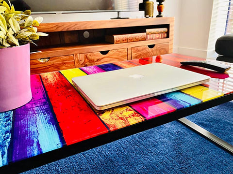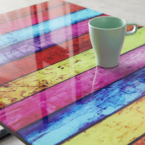 This coffee table was born from the meeting of an cabinet metal support base and glassy top. The rainbow colour wooden slats print brings a fantasy touch and an enhances the room.