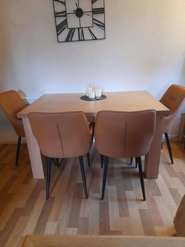 With its stain-resistant and waterproof faux leather, the Maxine dining chair is easy to clean. Wipe the surface with a damp cloth, avoid the use of chemicals and household cleaners as they may damage the finish.