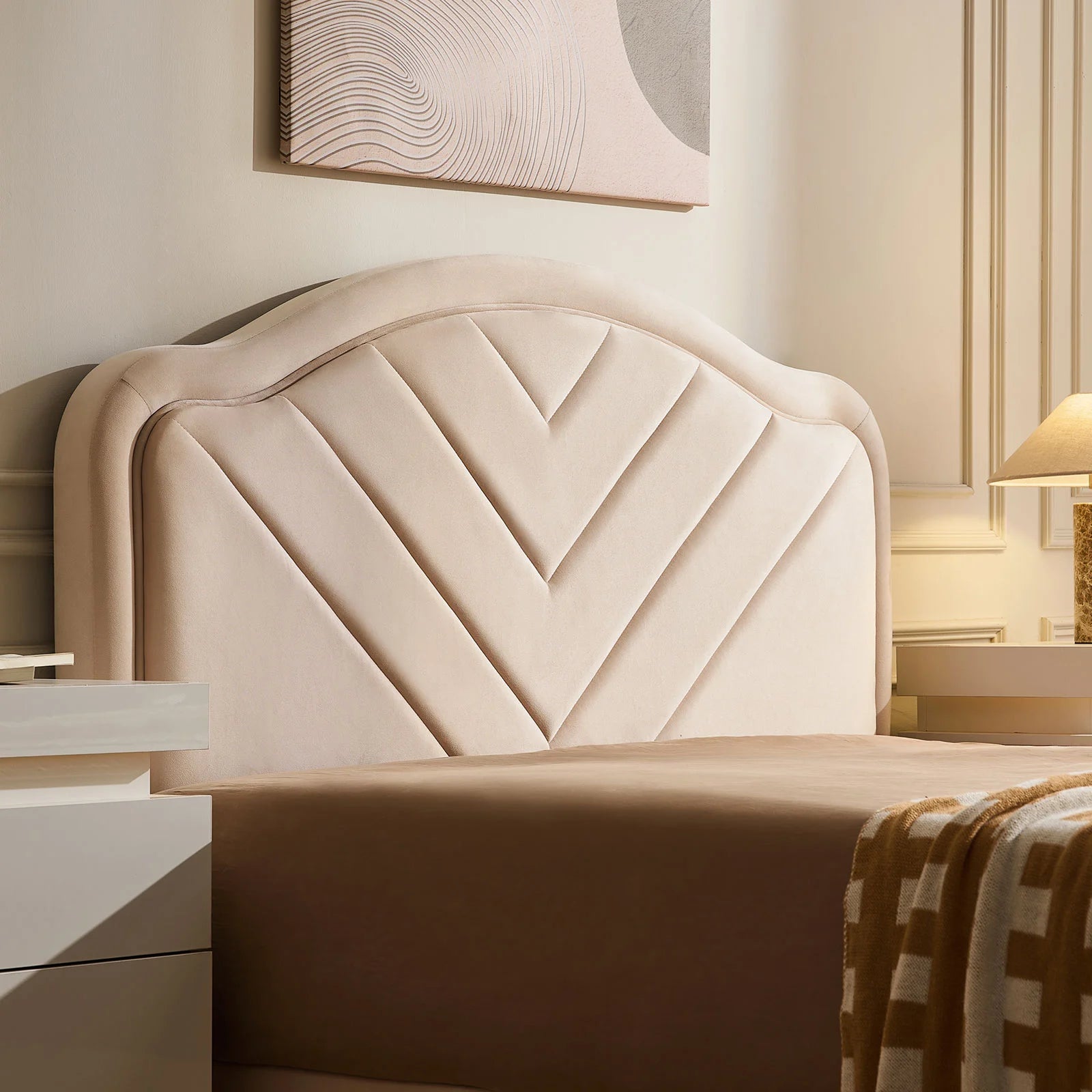 Covered in elegant velvet and filled with high-quality foam, this double upholstered bed, with its chevron tufted headboard, is soft and cosy.
