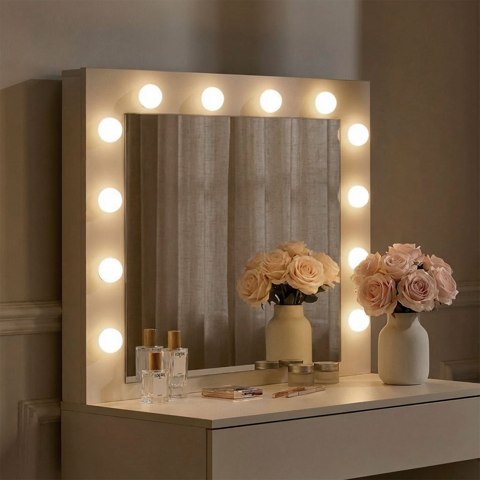 This Hollywood dressing table with lights features a large mirror and 12 LED bulbs, giving you bright, even lighting for flawless makeup, videos, and selfies.