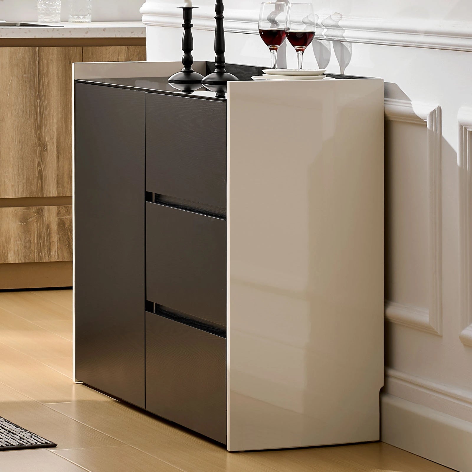 Crafted from E0-grade eco-friendly wood-based panel, this dining sideboard shows subtle wood grains. Its tempered-glass top adds a light, contemporary touch.
