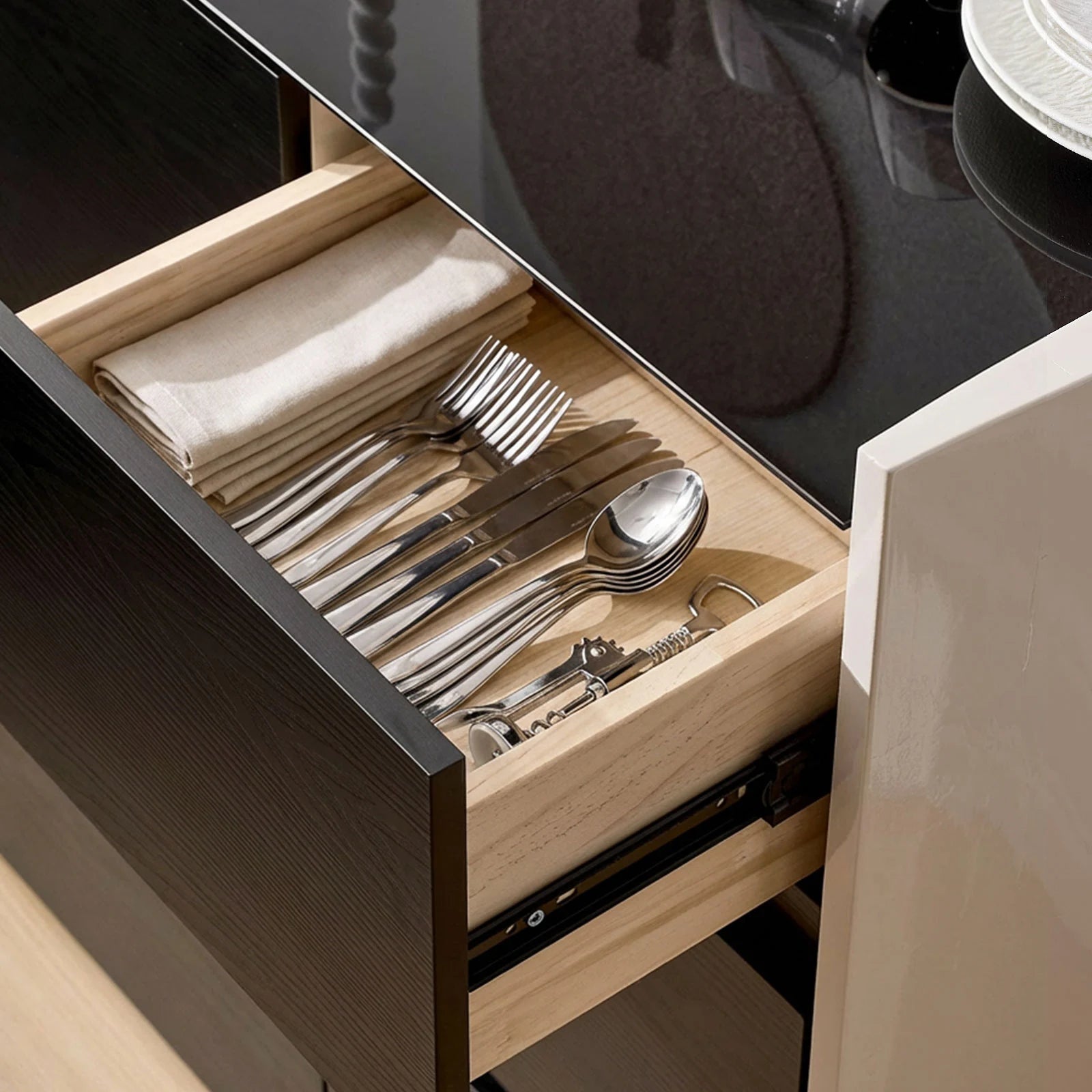 A thickened top panel supports serving dishes with ease, while the integrated cabinet structure enhances stability. Push-to-open fittings provide easy, handle-free access. The recessed base allows the cabinet to sit flush against the wall.