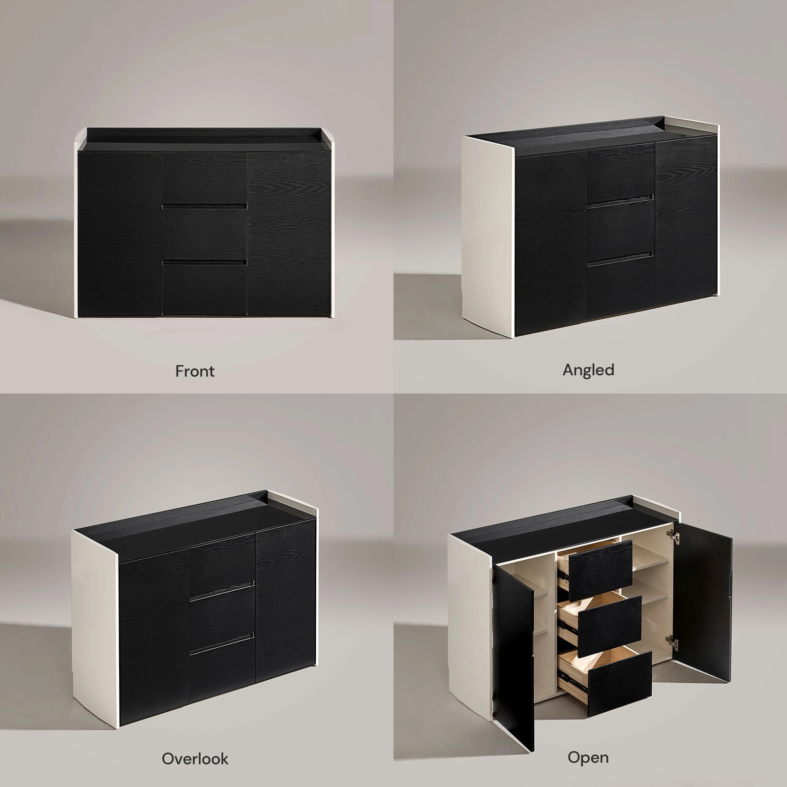 This wooden sideboard blends clean glass accents with black oak tones, creating a modern yet rustic look. The handle-less design brings a sleek, refined finish.