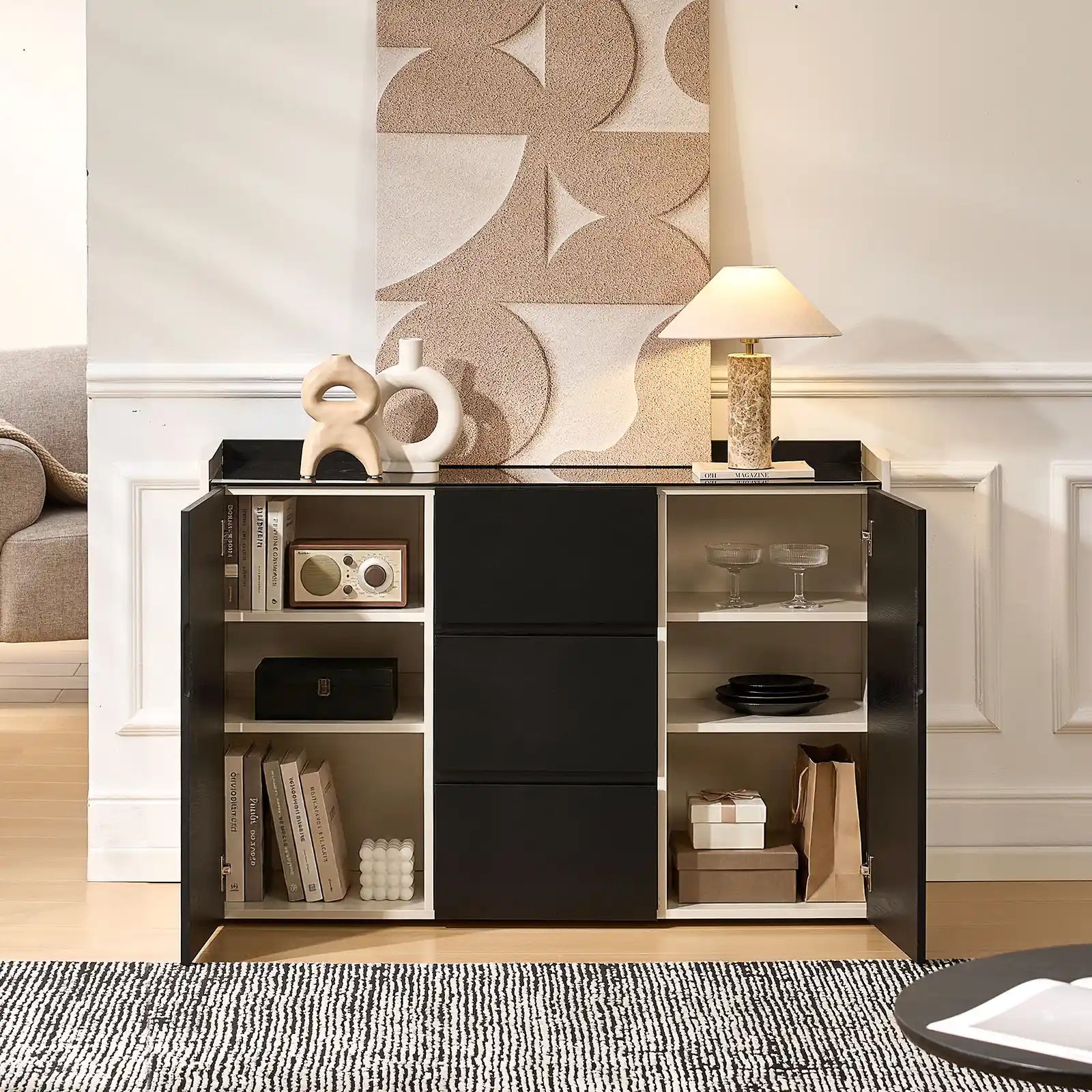 This buffet sideboard features two cupboards with adjustable shelves and three smooth-glide drawers, offering organised storage for a tidy kitchen or dining area.