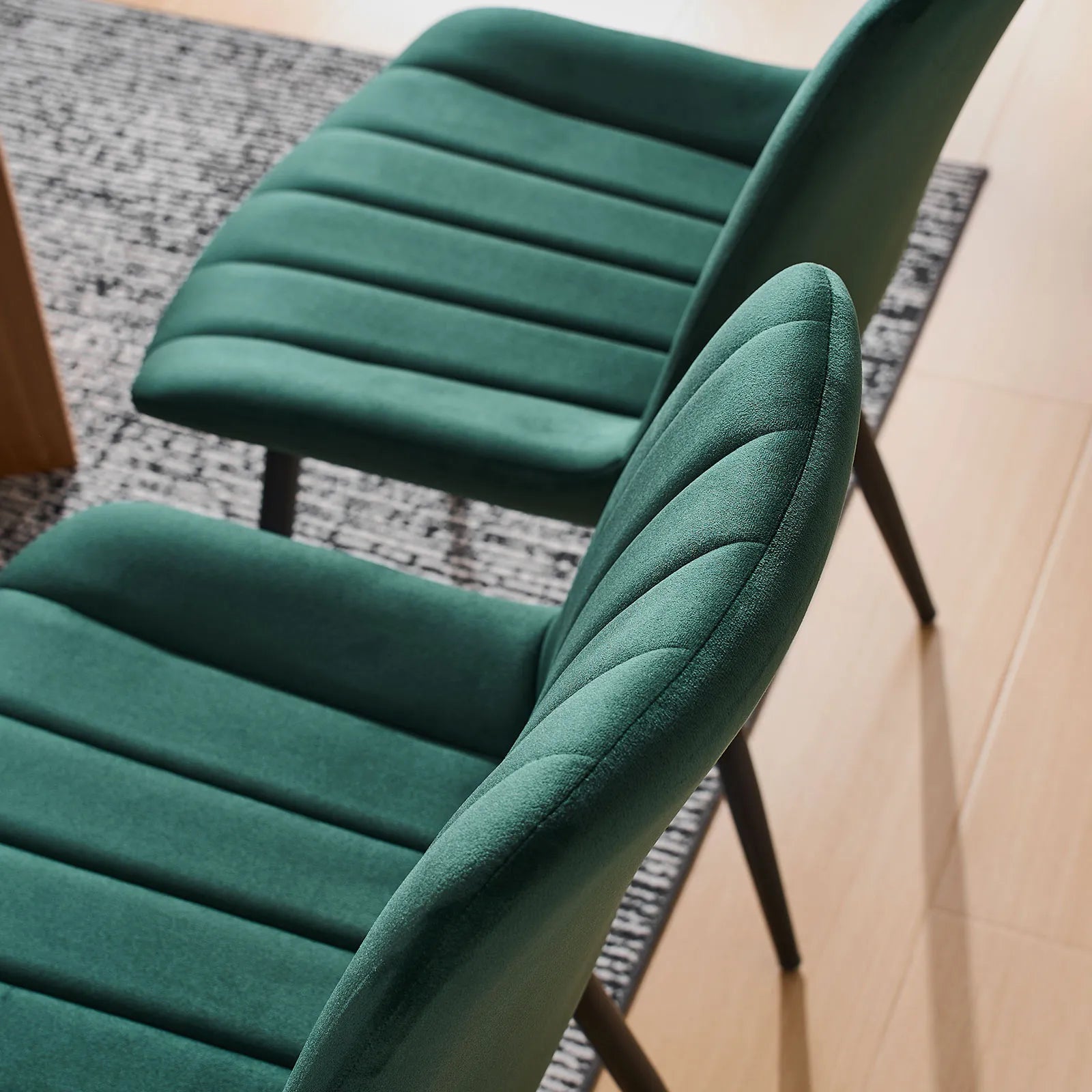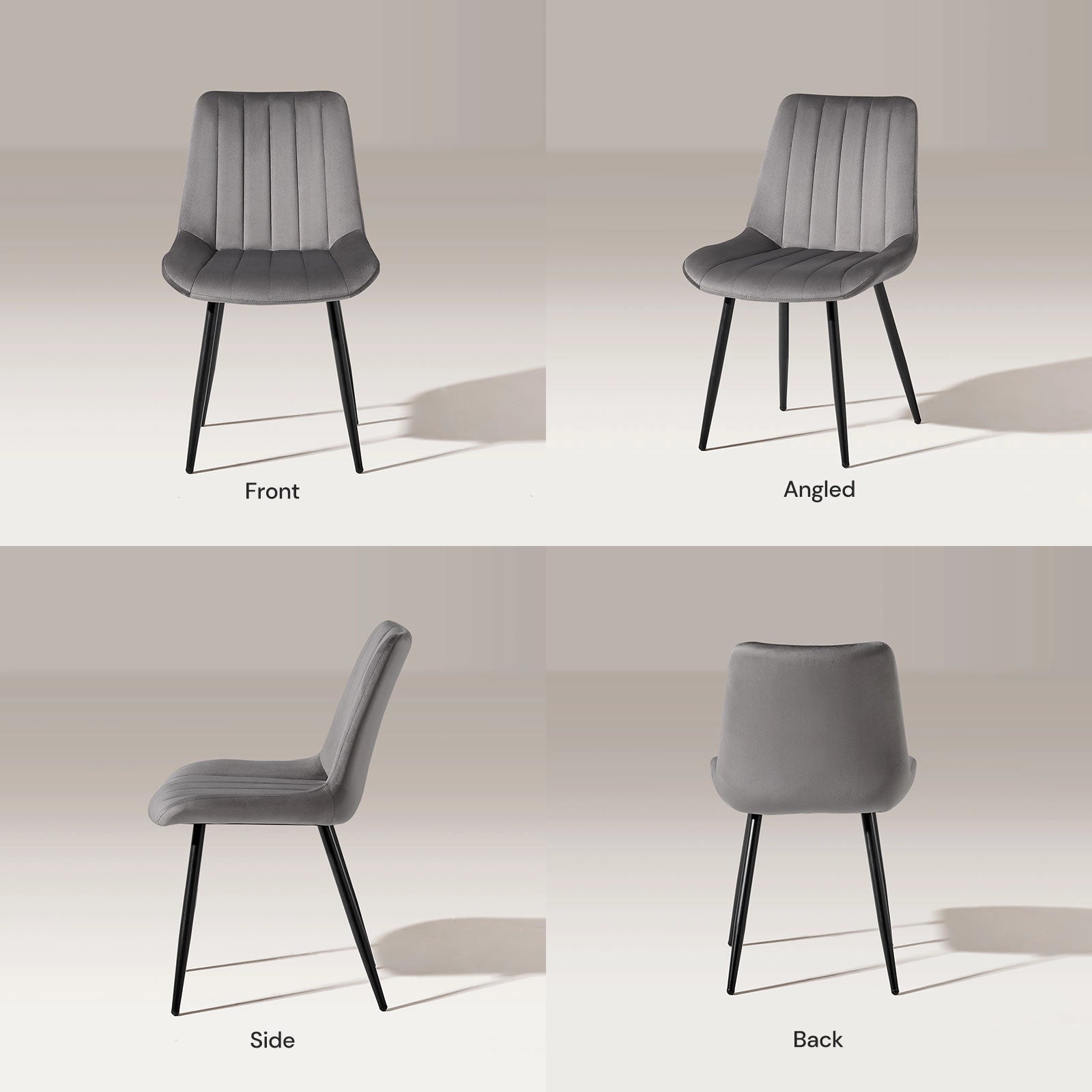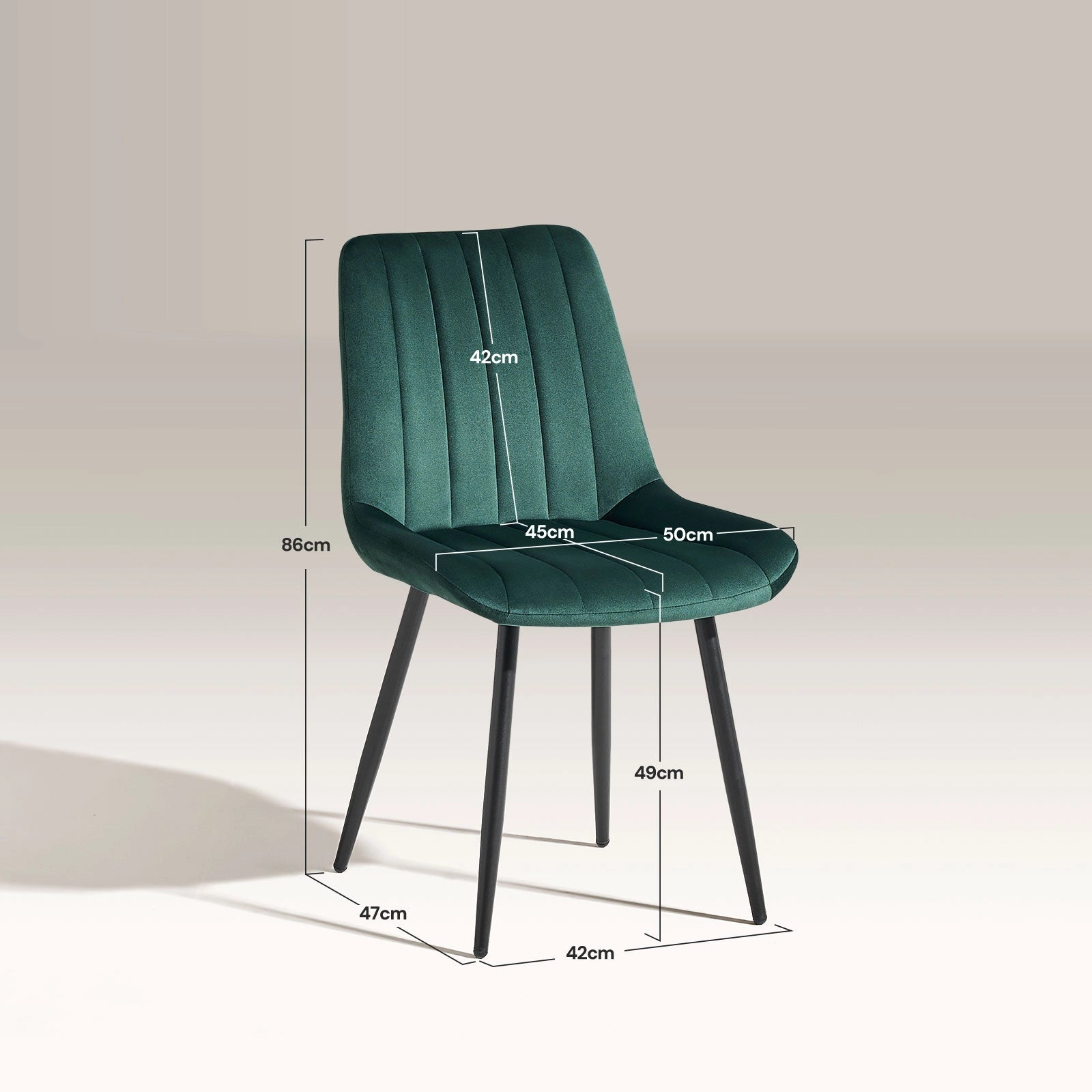 The Clair Velvet Dining Chair define sleekness with their armless design, curved back and black metal legs.