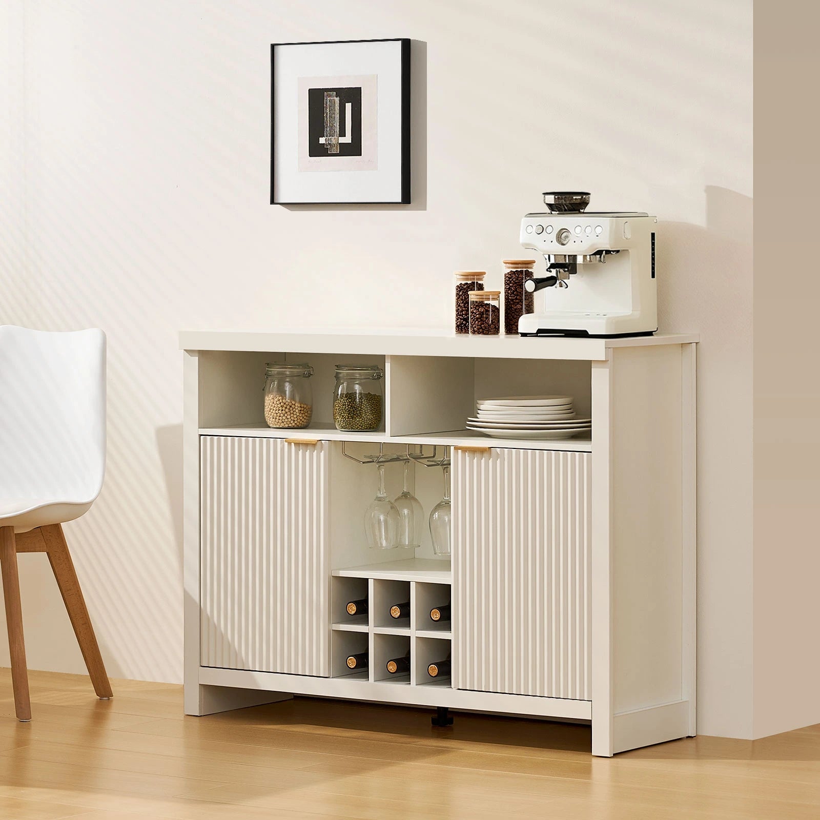 This Arden bar buffet sideboard offers thoughtful storage — two cabinet doors, open shelves, a 6-bottle wine rack, and two rows of glass holders to keep everything neatly organised.